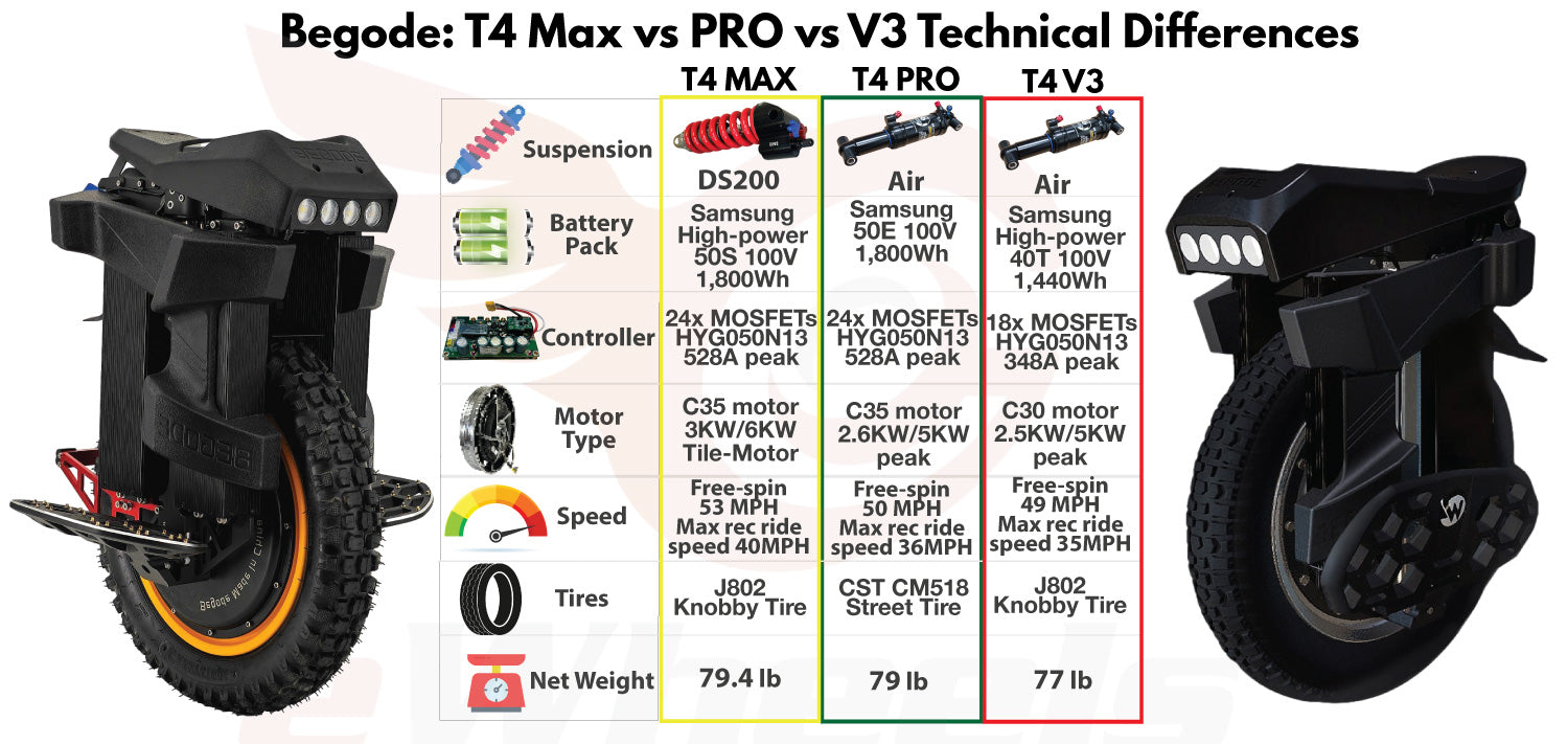 Following in the footsteps of the original T4 from Begode, the first 16" suspension wheel on the market, the T4 Max is the latest iteration on the T4 platform. While not a complete overhaul, the T4 Max does come with added features of newer Begode wheels, including the latest controller, coil shock, and motor technology.
