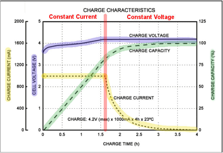 - Current Output: measured in Amps. When the voltage is set the 100%, once the charge level achieves >80%, the current level will start to ramp down into the Continuous Voltage mode.