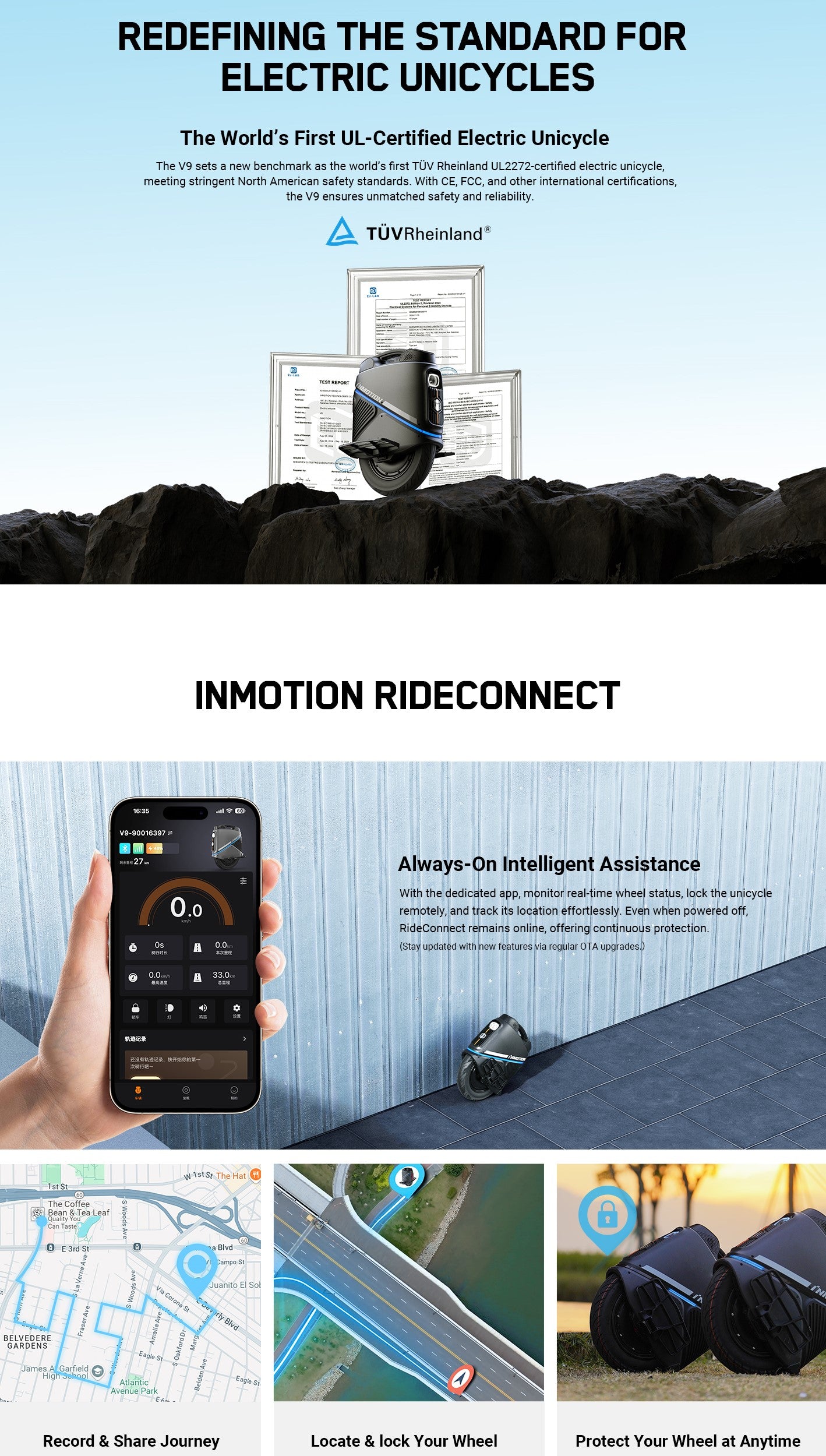 - GPS Tracking: Offered free for the first year, you can locate and remotely lock your V9 from anywhere. The V9 is the first wheel to offer this feature!