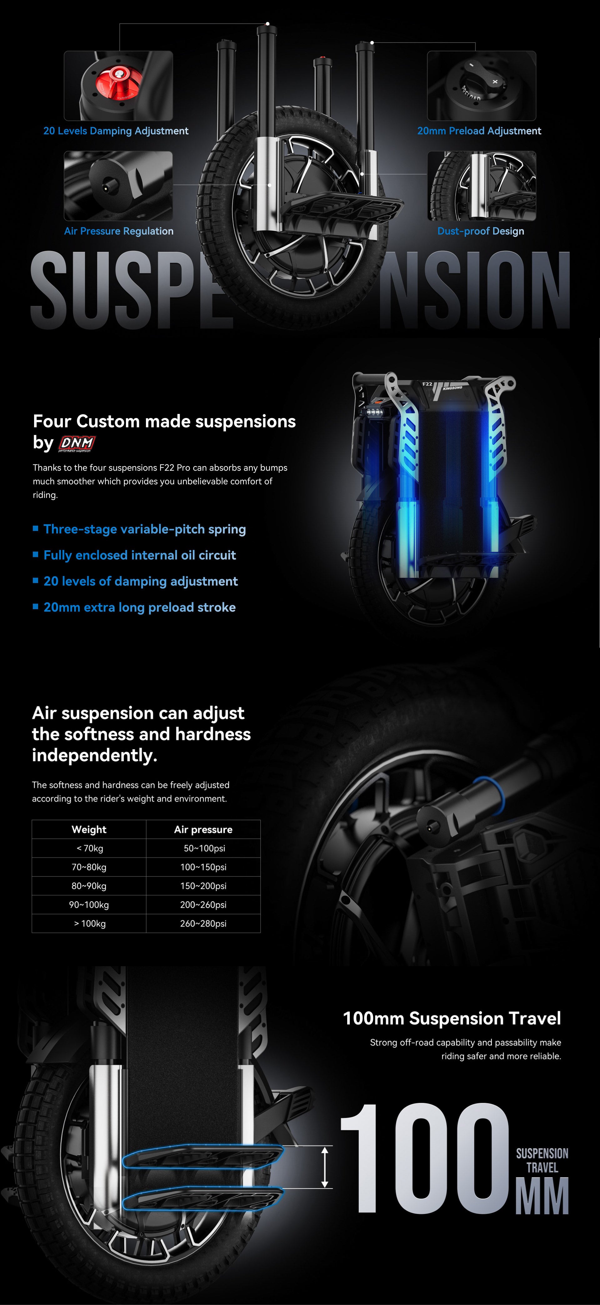 Suspension: Unique DNM quad-piston setup with 100mm of travel for excellent frame rigidity, with two inflatable air pistons that use progressive internal springs, adjustable damping, and two preload adjustment pistons.