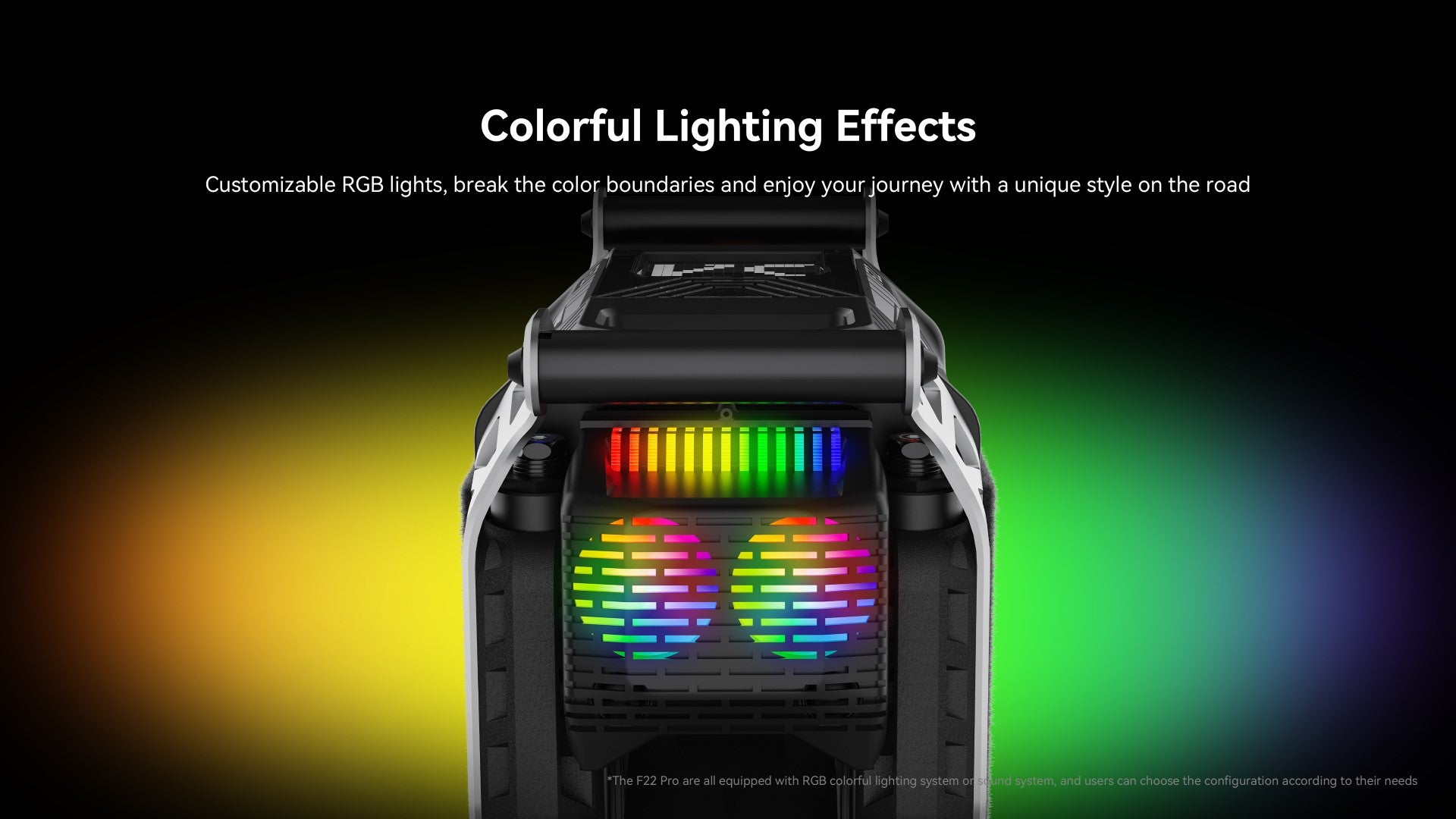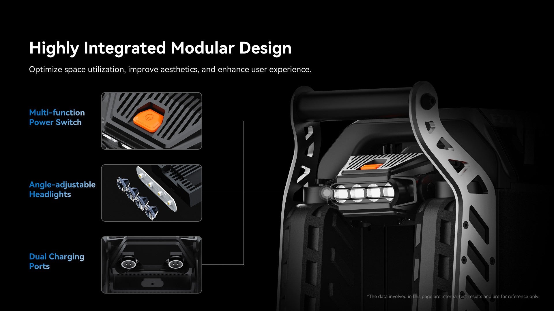 Other: integrated trolley handle, Bluetooth music, USB-C device charging port, adjustable headlight, accent lighting, and more.
