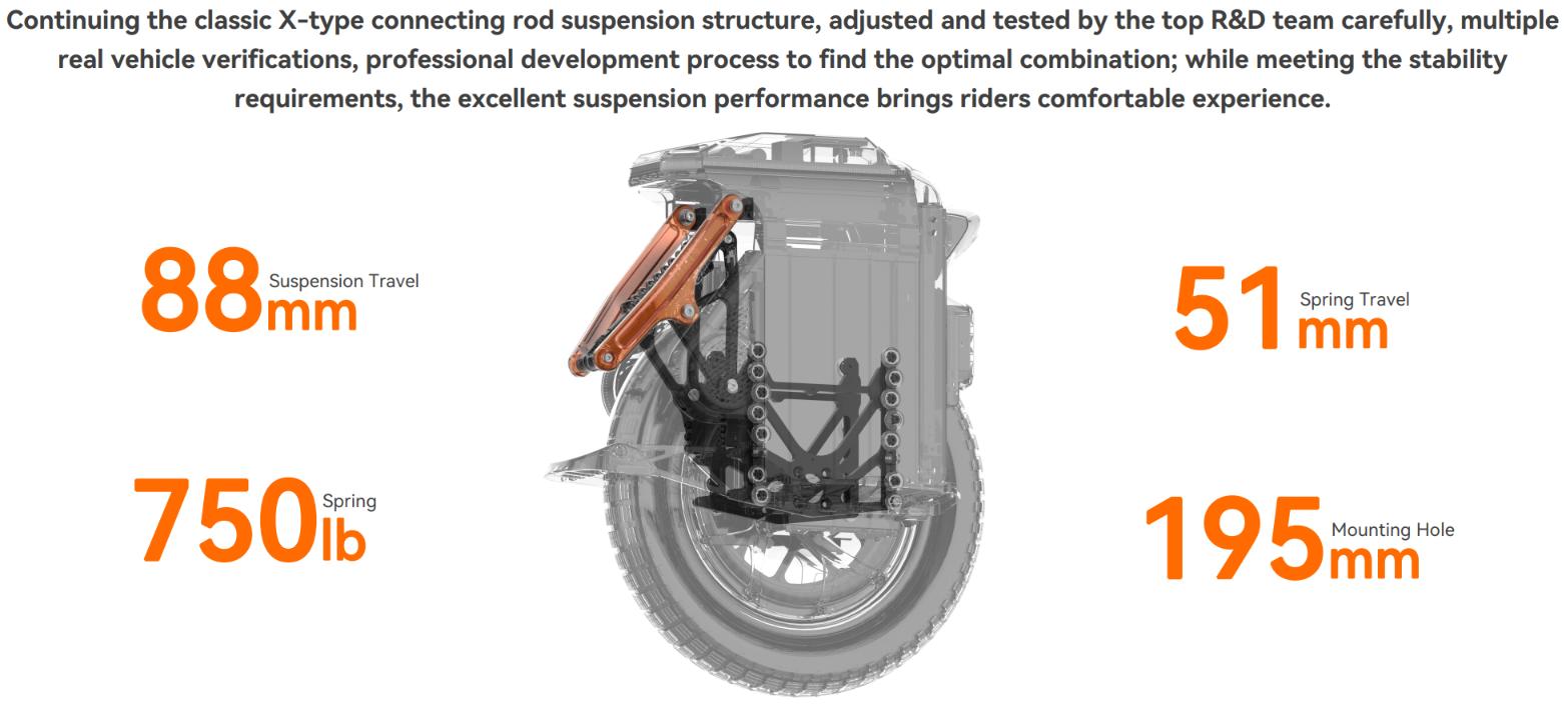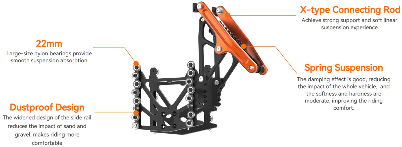 - Suspension: 750lb shock, with 85mm of travel, using the 5th generation nylon roller system