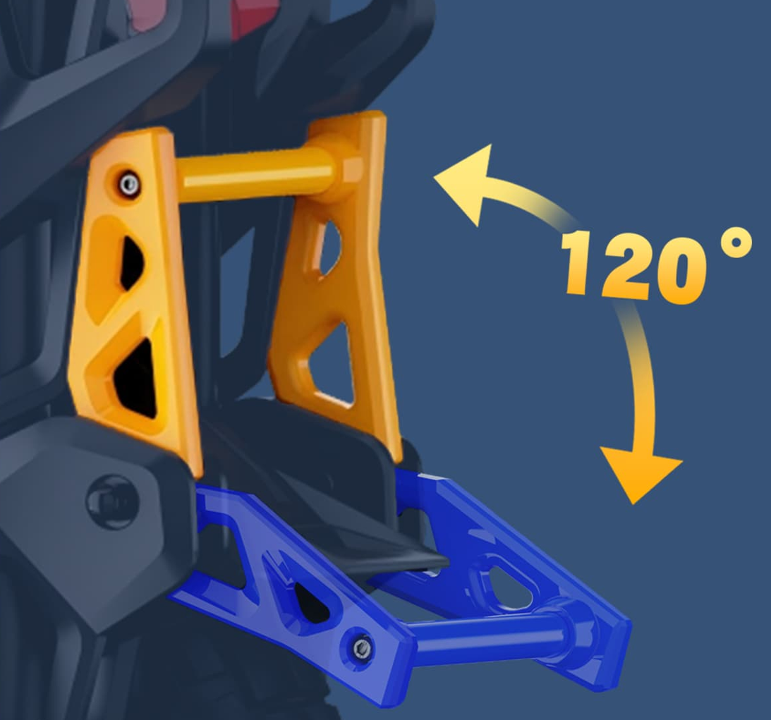 First introduced on the NOSFET Apex, and then later the Oryx, the Lynx-S' kickstand is a folding design. One of the main failure points in a crash tends to be a Wheel's kickstand, as it protrudes out the farthest from the body. A folding kickstand design prevents it from getting damaged as easily during a fall, while also reducing the Wheel's overall footprint for storage. This approach also has the potential to make replacing the kickstand less expensive if it does sustain damage, in the event that the kickstand arms or crossbar are damaged, but the mounting brackets remain intact.
