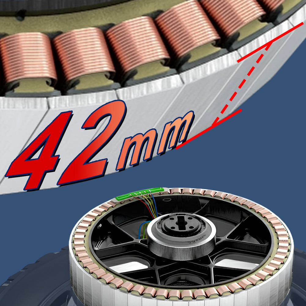 - Motor: 3,800W motor, ~60 MPH maximum speed (5MPH higher than Lynx) , providing an excellent balance between rotational speed, Wh/mile efficiency, & torque. This is achieved with a wider 42mm stator/permanent magnet width.