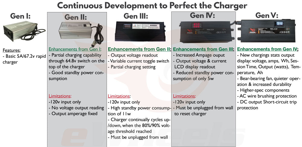 High Power Output: with up to 5 Amps of current, this charger has a maximum DC output of 273 Watts, the equivalent of a run-to-charge ratio of about 1:1 ratio, assuming cruising at 20mph on level ground. This is 2.5x quicker than the stock 2A charger which comes with most eScotoers.