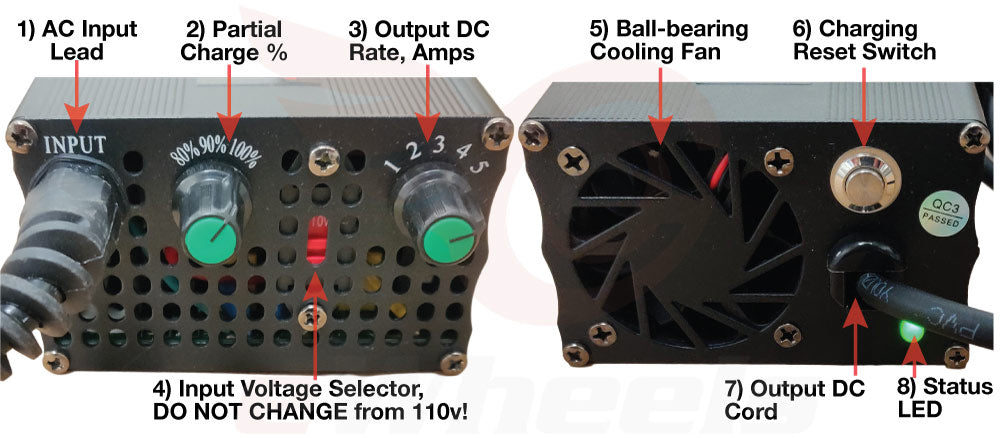 Reset button: once the selected charge % has been reached, the charger will automatically shut-off but remain in standby mode. When plugging the Wheel back in, simply press the reset/power button, to restart the charge cycle again.