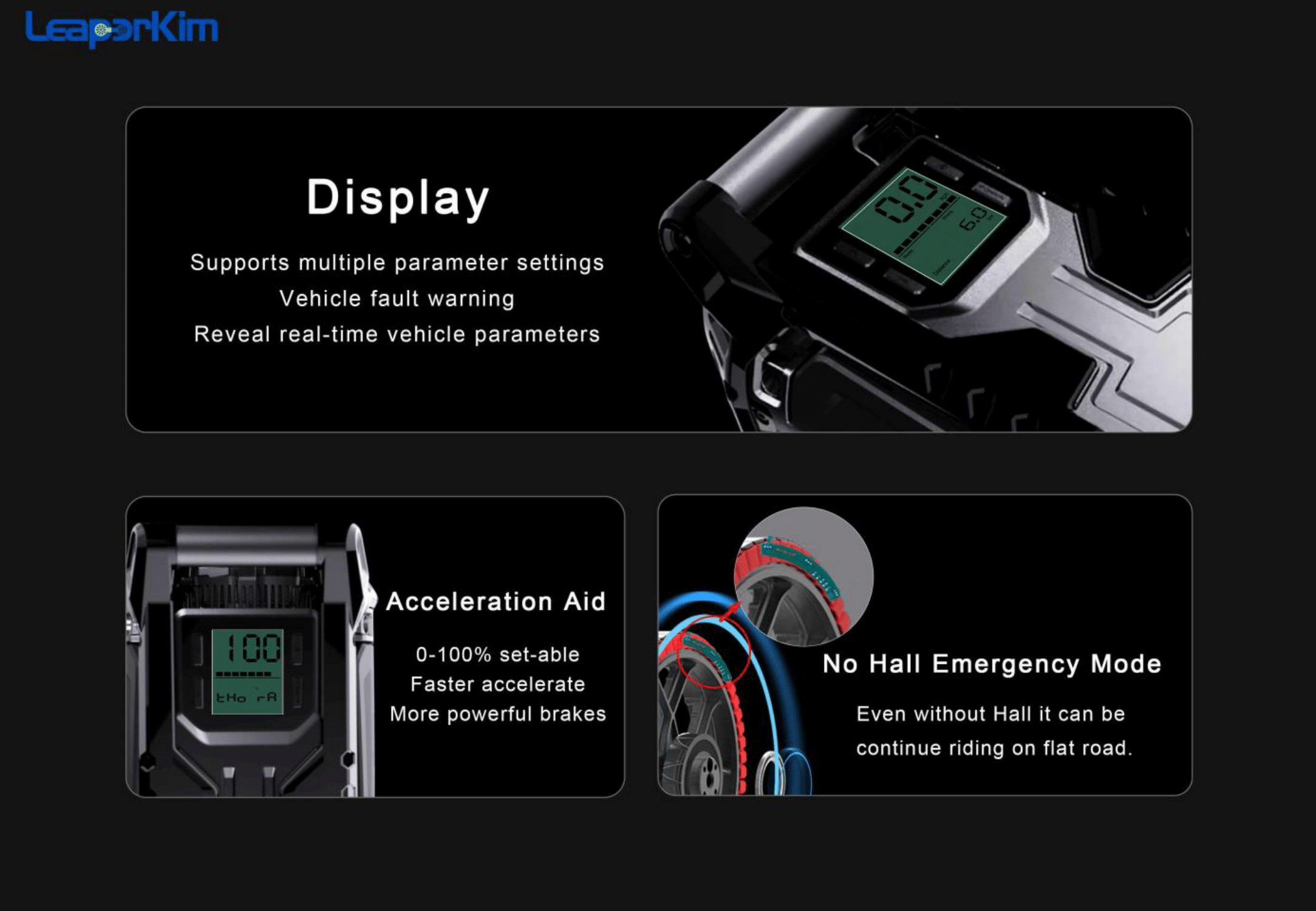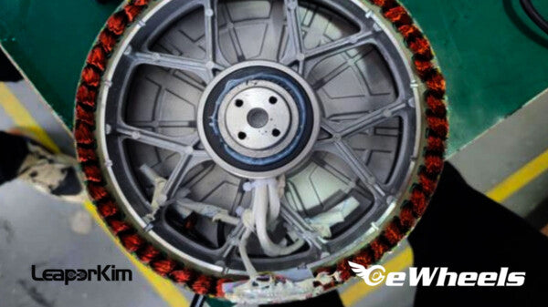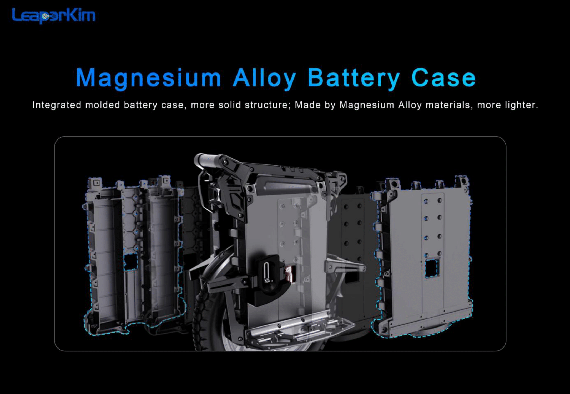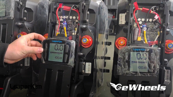 The 126V Samsung Packs use INR217000-50S cells, 2,220 watt-hour capacity (2 sets, 30 strings, 2 parallel configurations), and BMS monitoring for charging rate and temperature (more details to come). The new BMS allows for 20A max dual charge ports, allowing owners to fast charge their wheels last minute before a commute to the office or during a group ride rest stop. Leaperkim has also added anti-collision energy-absorption boxes to the packs, making them safer in a fall.