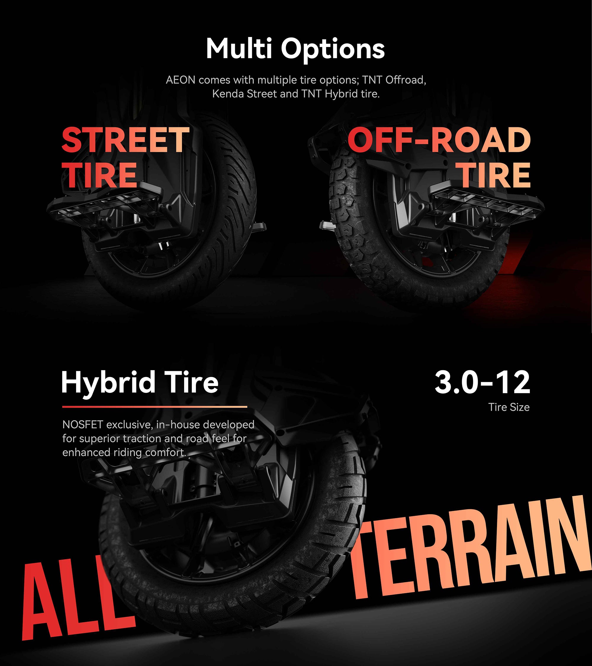 Tire: choice of three tubeless tire options: customer TNT hybrid tire, kenda street-oriented, or TNT knobby offroad-oriented tire.