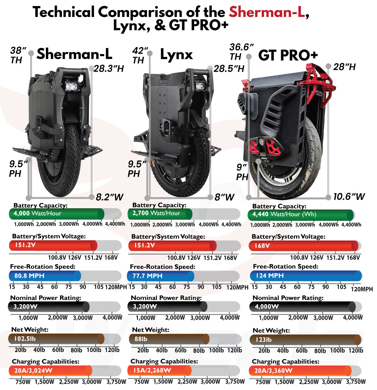 Comparing the Sherman-L against its outgoing predecessor, the Sherman-S, will reveal all the improvements that have been made. The Sherman-S is about ~7lbs lighter, but the Sherman-L is superior in terms of battery capacity and monitoring due to the inclusion of a smartBMS, safe top speed as a result of the higher system voltage, and firmware refinement, notably the new sensorless motor operation feature that can keep the wheel upright even in the event of a hall sensor failure while riding, a first for the EUC industry.