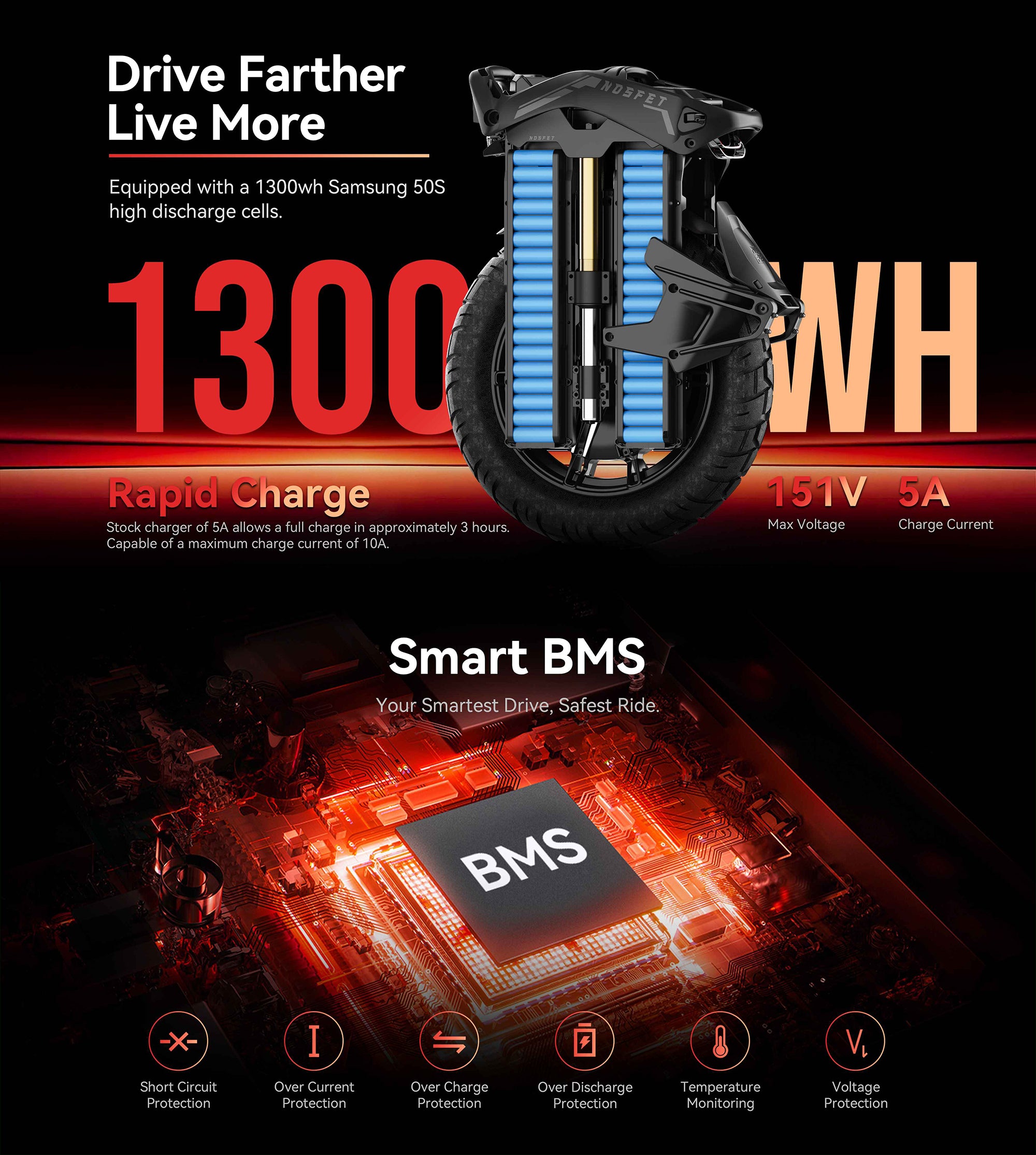 • Battery Pack: high-power Samsung 50S 1,300Wh/151.2V battery pack, with SmartBMS, capable of rapid-charging to 10A/1,510W.