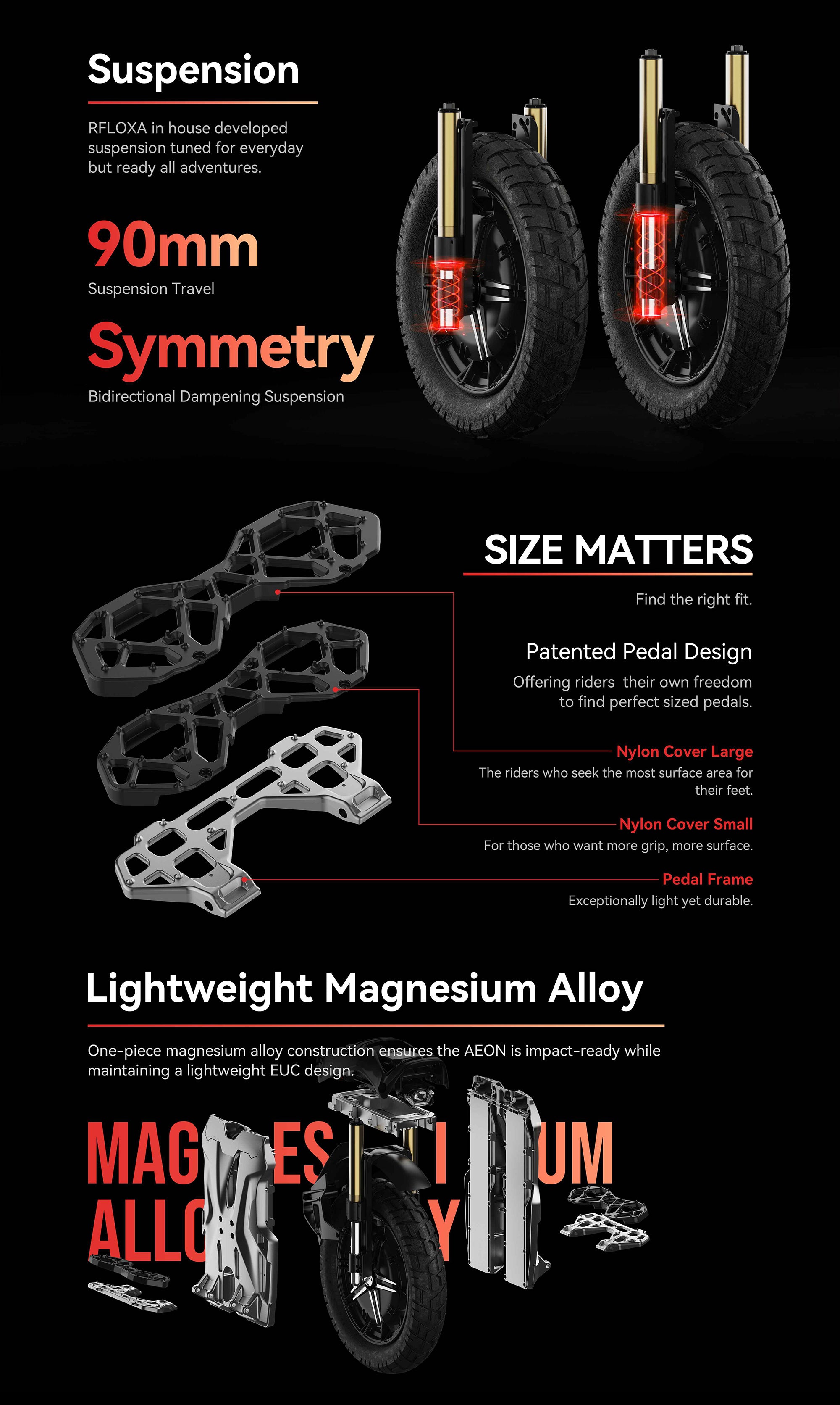 What differentiates the Aeon from the Aero? There are a few key differences, including a larger tire for more stability, a higher battery voltage for a higher top speed, longer suspension travel for an improved ride feel, and a few features like the new adjustable pedals. The only downside is that this comes with an additional 10lb weight penalty compared to the Aero, in exchange for some performance improvements, but the machine is still very lightweight compared to other suspension offerings on the market at just 64lbs.