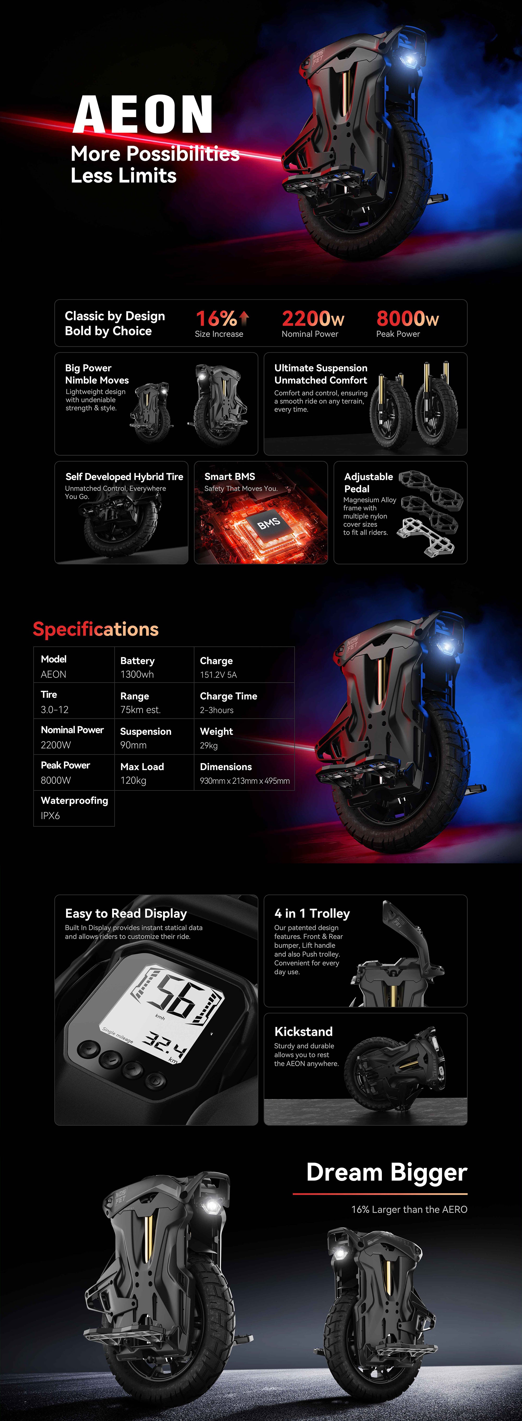 Who is the Aeon for? Bucking the recent trend towards heavier Wheels, the lighter-weight Aeon is ideal for someone who wants a Wheel with the best performance to weight ratio on the market. The Aeon slots nicely between the smaller Aero and the larger Patton-S in terms of weight/size and capability, and it's an excellent option for first-time riders and enthusiasts alike. If you're a fan of the Aero, but wish it had a higher top speed or a bit more performance, the Aeon is perfect for you!