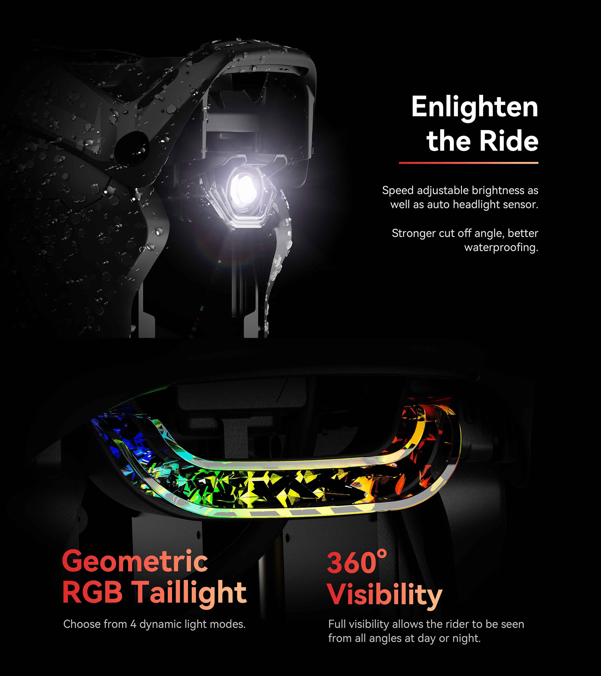 • Other: new 4 mode RGB tail-light; integrated kickstand; fracture resistant mud-guard; auto-headlight brightness; folding trolley handle; adjustable pedal size.