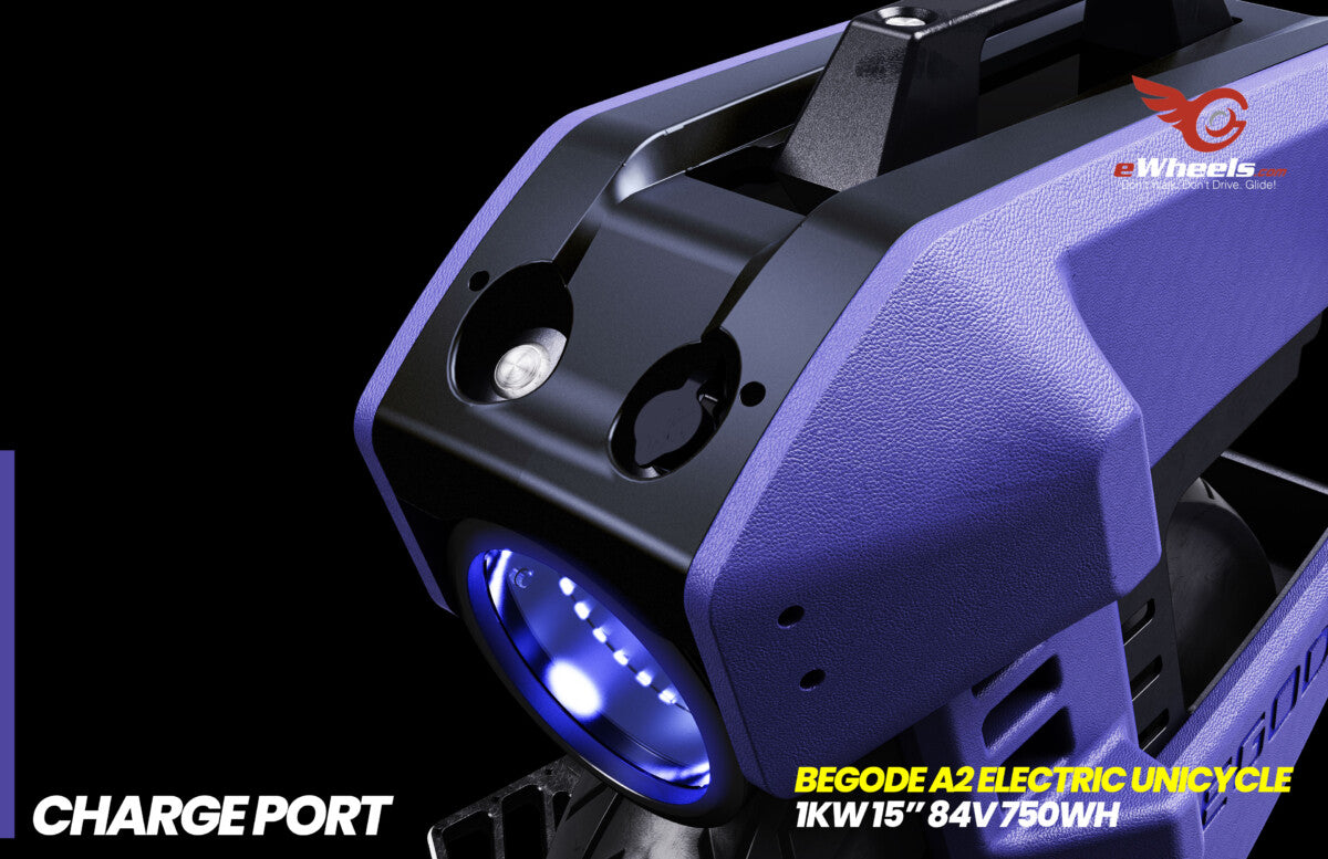 Because the market is so competitive, companies are adding more features to attract customers. Begode gave the A2 the essential elements for an entry-level wheel, like a kickstand, carrying handle, top display, spiked pedals, and an upgraded frame. There is a big round headlamp with 5,000 lumens and a square grid-style matrix lamp for lighting. The illumination is marketed as being adjustable for fun combinations and patterns.