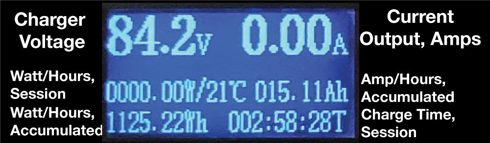 Voltage/Current Display: both the voltage & current are shown on a large LCD display mounted on the top of the charger. This gives you an instant snapshot on the exact progress of the charging status. When the current starts to drop, it is an indication that Constant Current (CC) phase has completed & is now starting the Constant (CV)—this is where the battery is about 80% charged & where the charging cycle starts to ramp down. CC/CV mode is attained only at the 100% voltage selection—on the 80-90% setting, once the set voltage is reached, the charge cycle will terminate.