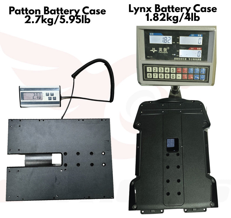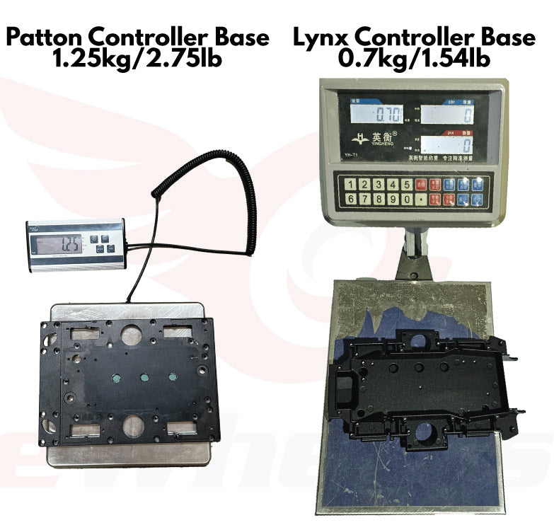 – Controller Base/Tray: finally there’s the controller base, which also serves as the heatsink. The Patton has a hefty block of cast aluminum, weighing in at 1.25kg/2.75lb. The Lynx’s controller tray (a more complex shape/geometry) at almost half the weight at 0.7kg/1.54lb.