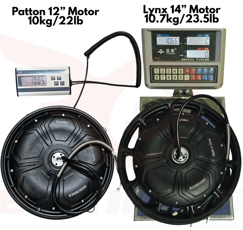 – Motor/Rim: despite the 2″ larger diameter & containing more copper in the stator, the Lynx 14″ motor assembly is just 0.7kg more than the 12″ Patton motor. If the same aluminum alloy was used on the Lynx rim, one would expect to see a motor weight of about ~13kg/28.6lb.